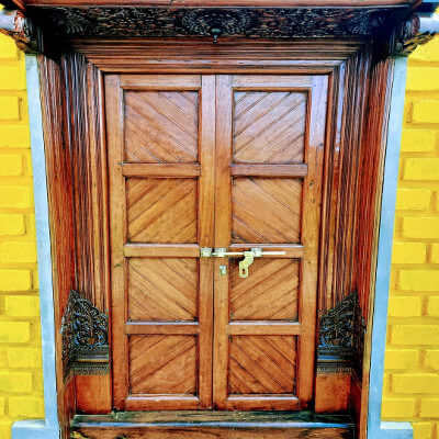 Over 100 years old teak wood door, sourced from Andhra Pradesh, which leads to Sumeru from Nandanavana